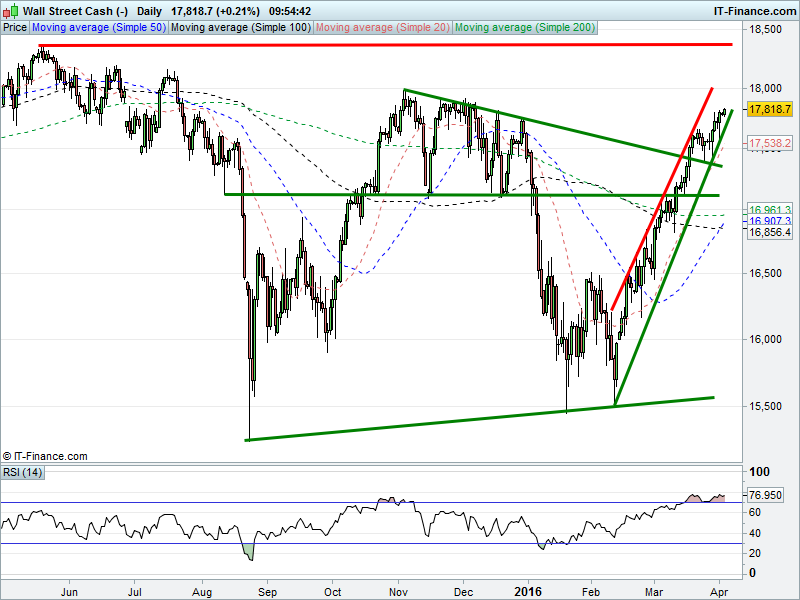 The Dow Jones is holding its steep uptrend, outperforming peers with its break above 17800 to fresh multi-month highs on the premise of lower US interest rates for longer bolstering risk appetite. RSI may be overbought, but could well stay this way. And 50-day pointing towards a golden cross with the 200-day MA.