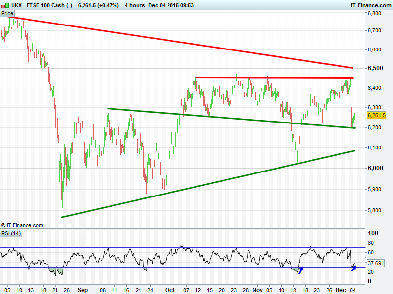 UK Index  found intersecting support at 6200 and already regained 6250. DAX also benefited from intersecting support to bounce of 10640. Wall St done the same at 17400 but Gold still held back by falling channel boundaries.