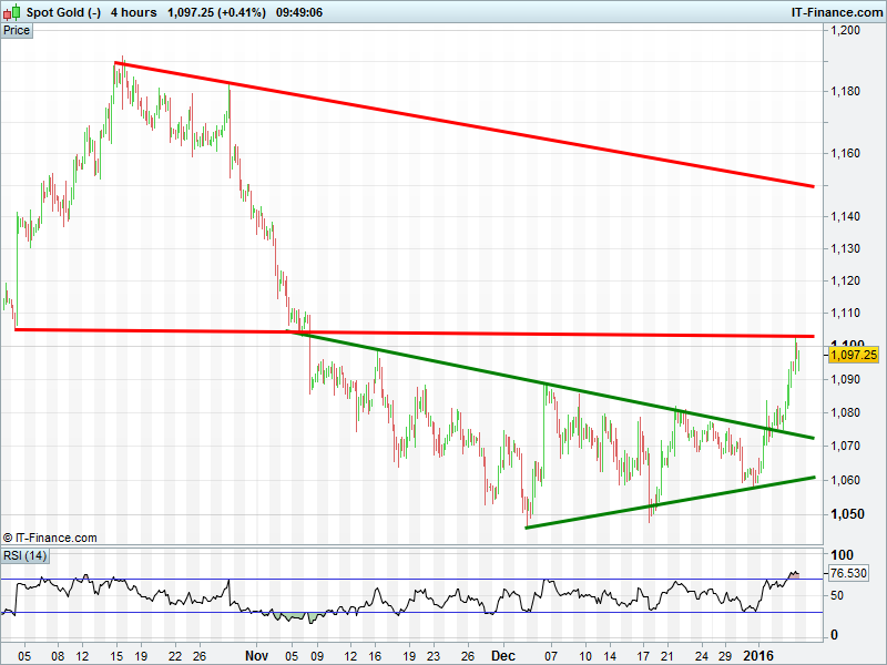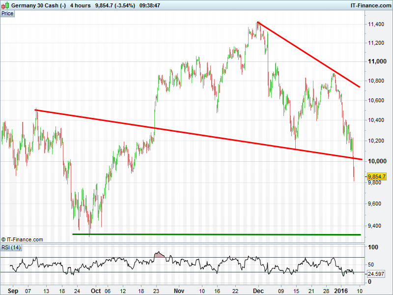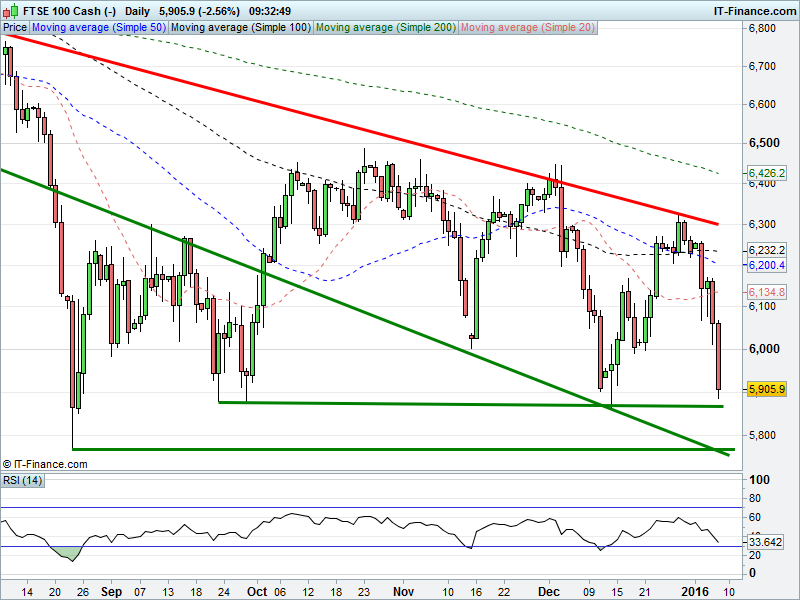 UK Index back at 5900, close to Dec lows 5865. DAX taken another leg lower to break below 10000. Wall St’s breakdown has continued at pace to test 16500. Gold has risen as far as $1100 thanks to safehaven seeking.