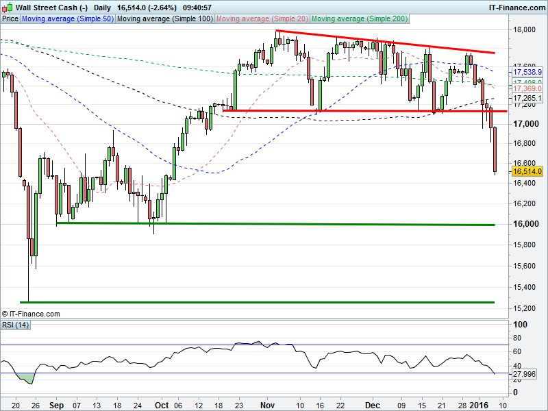 US Dow Jones futures continue to fall back, even accelerating, towards late summer and early Autumn levels of 16000 and 15260 respectively.