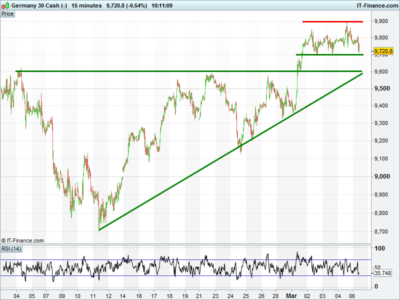DAX still sideways around 9800 with the bulls waiting for rising support to kick back in. The Bears , however, are concerned about the last 5 days which have all seen sell-backs from their ventures beyond 9800.