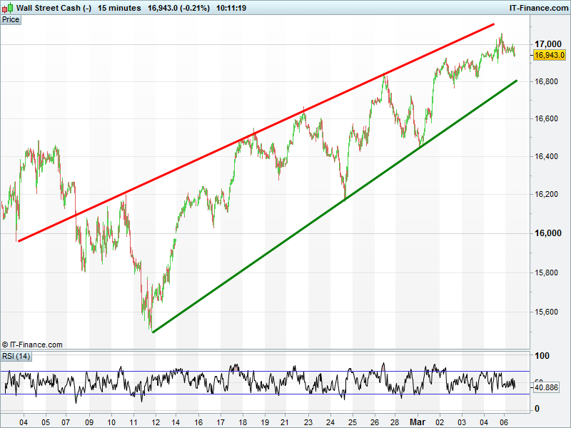 UK Index testing 3-week rising support at 6160. DAX still sideways around 9800. Wall Street testing 3-day rising support at 16940. Gold bounced off 3-day rising support at $1260.