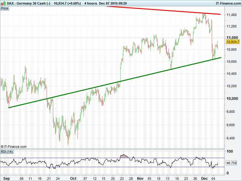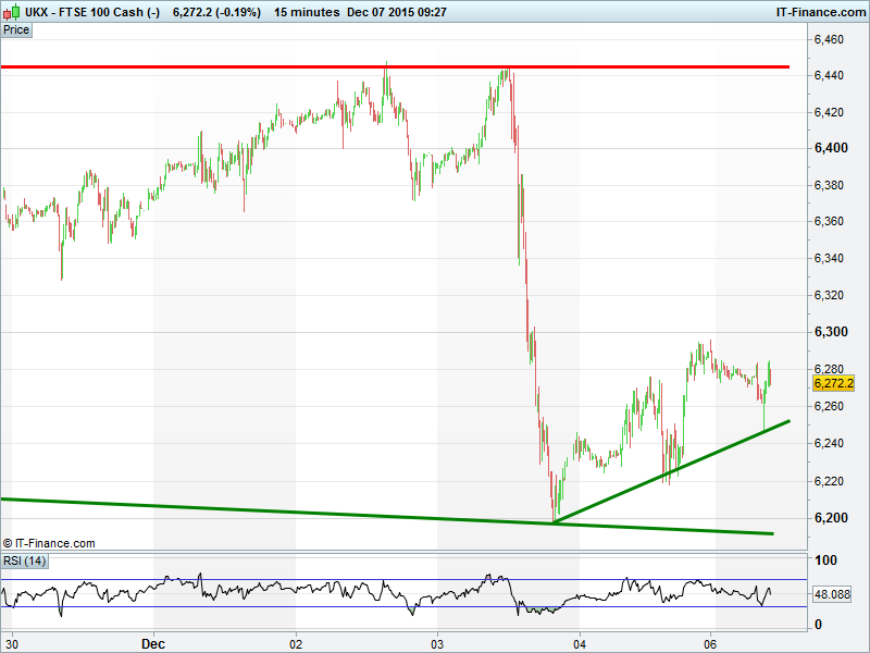 UK 100 managing to hold its bounce off 6200, but a test of 6300 is now required to keep it going towards the 6450 ceiling. The risk is that the bounce is a mere flag within a bearish flag pattern that correct much lower.