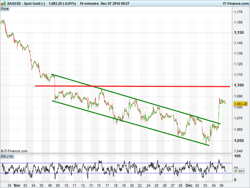 Gold’s broken out from 3-week falling channel despite the USD rising on increased odds of a Fed rate rise. Short squeeze likely the driver, given that the metal is included in the group of overcrowded trades we saw reacting to Thursday to the ECB announcement. Another up-leg due? Pausing for bullish flag?