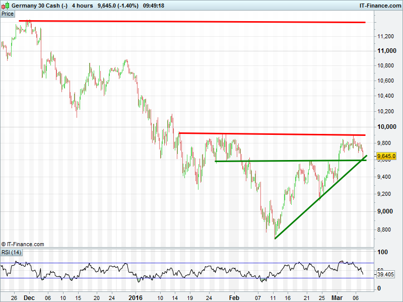 DAX broken below 5-day floor at 9700, but already found support via Feb rising low at 9630. Can the uptrend be maintained?
