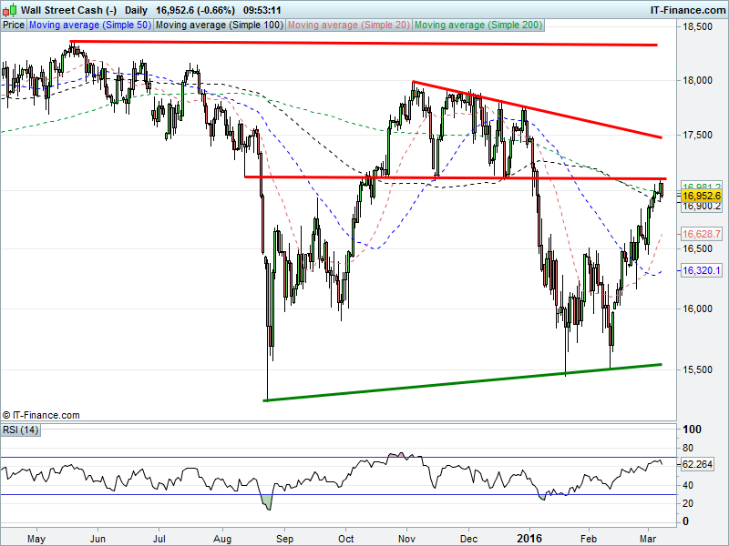 US Dow Jones struggling around 17000 after strong rally. Will late 2015 lows prove too difficult a hurdle to clear? Still holding above 100-day MA.