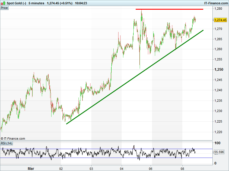 Gold’s bounce of 4-day rising support has taken it back to $1275 and any further souring of risk appetite could result in a retest of recent $1280 13-month highs.