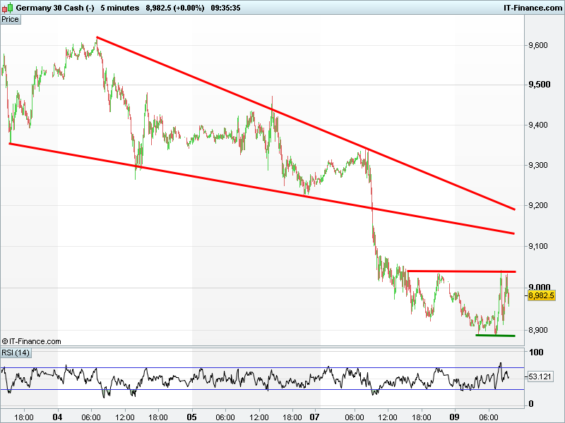 DAX consolidating like the UK Index , deciding on its next move. Break-out from channel could see rally equating to 150pt height of channel. Development of rising lows this morning could be bullish. Still in a major downtrend.