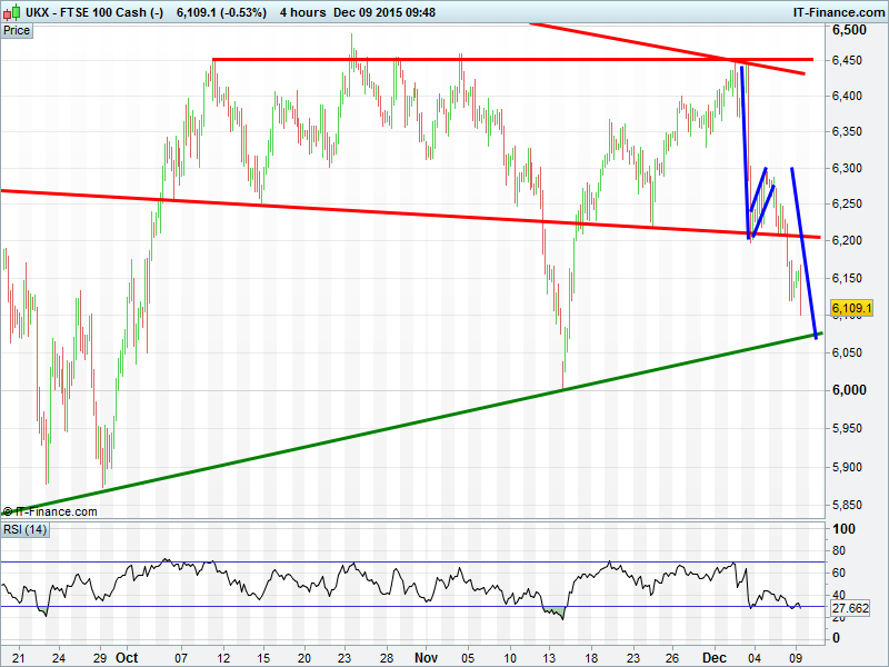 UK 100 weakness taken it back to 6100, but not quite as far as 6075 where we would complete the bearish flag pattern we have been harping on about.