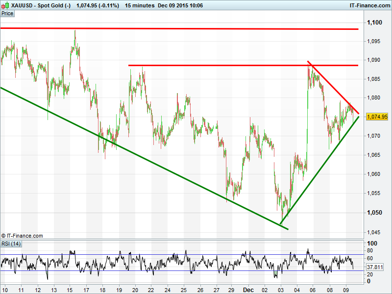 Gold’s is sitting right a the $1075 apex of a narrowing pattern, awaiting a break of with the trend of rising lows or falling highs. Potential for rising channel since Monday to prevail?