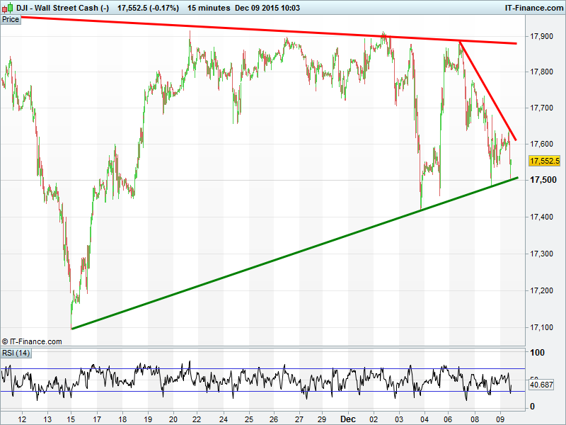 UK Index  found support at 6100 but bearish flag pattern couple yet complete around 6075. DAX broken below intersecting support at 10700. Wall St testing 3M intersecting rising support at 10500. Gold at $1075, right at the apex of a narrowing triangle .