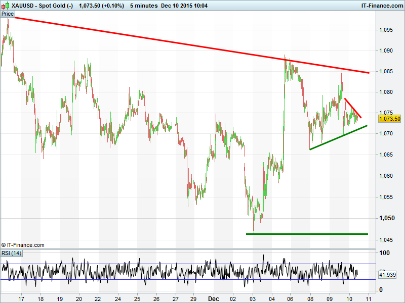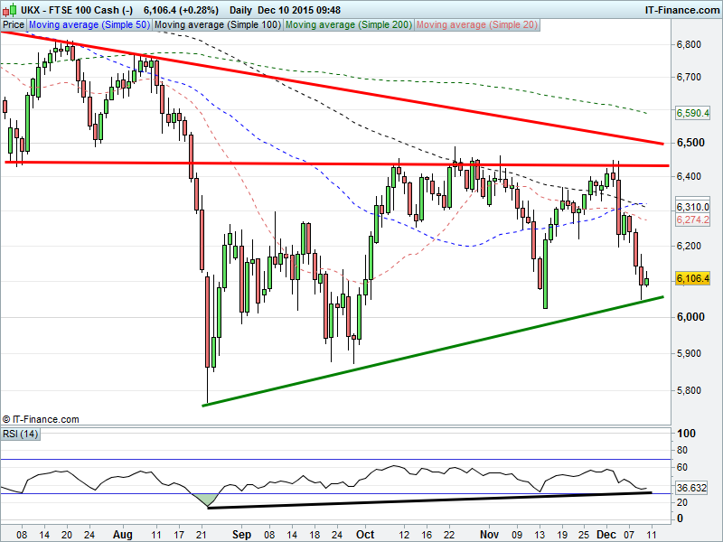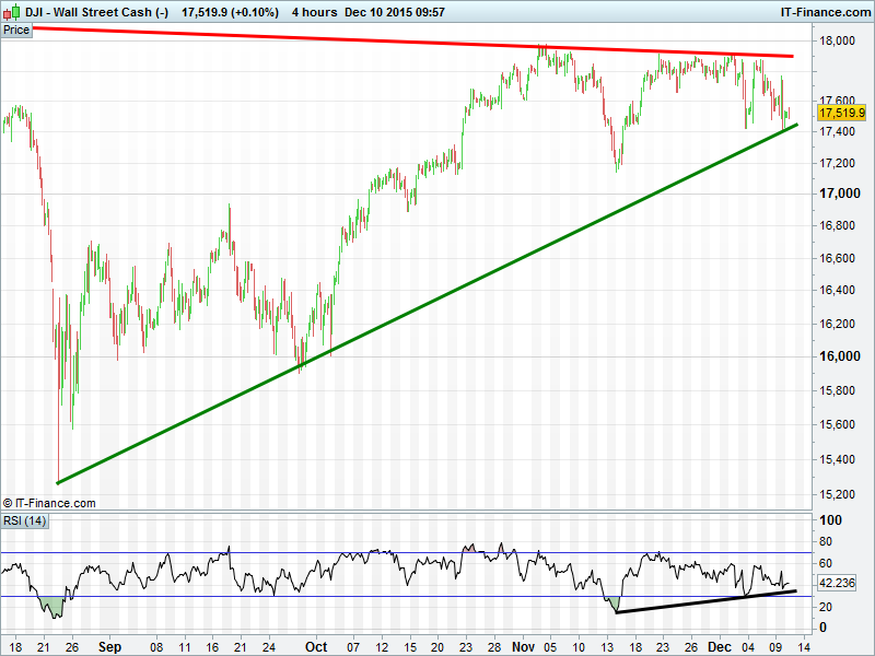 UK Index found 4M rising support at 6050 but December downtrend remains a hurdle. DAX bounced at 17440 thanks to intersecting support from early July, but still in December downtrend. Wall St still holding August uptrend at 17500 with positive divergence on RSI. Gold in another tight narrowing range around $1073.