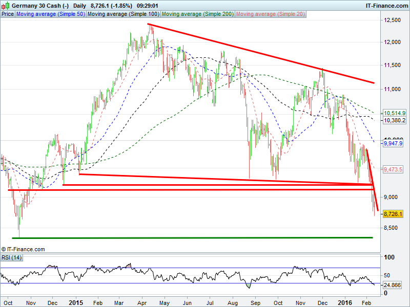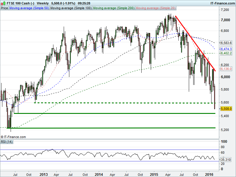 UK 100 broken below 5600 to test 5500 3.5yr lows as 14-month downtrend accelerates. Potential for sell-off to go as far as June 2012 lows of 5440 should global growth fears and banking sector concerns persist. 5500 holding for now.