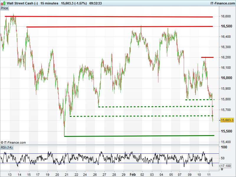 US Dow Jones broken below 3 levels of support to trade levels last seen in late January. The index is holding up best versus UK Index and DAX, with the 15600 yet to be lost.