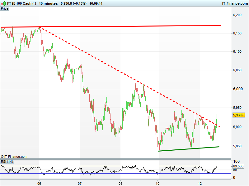 UK 100 found support around 5850 and now broken above trendline of falling highs from beginning of year. Can it better recent highs shy of 5950?
