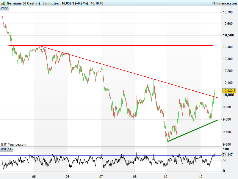Germany’s DAX  rebound continues with a break above 9980 to test 5-day trendline of falling highs just shy of 10000. Breakout or fakeout?