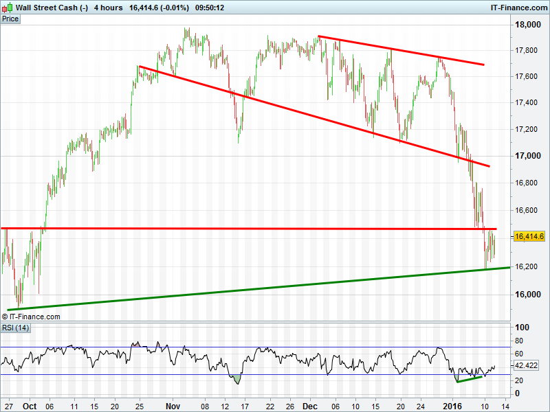 US Dow Jones futures found support at 16200, but now just bouncing around 16200-16475, deciding whether to break higher or lower. RSI still recovering from oversold.