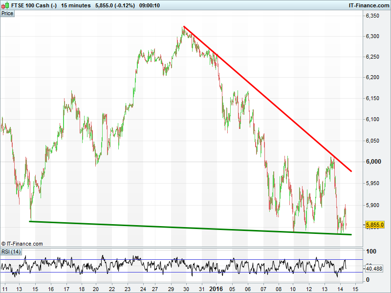 UK 100 testing recent lows again this morning after overnight bounce failed at 5900. 20146 downtrend persists, extending that from May 2015.