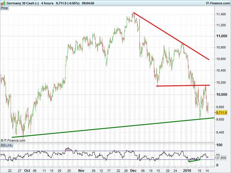 DAX rebound failed at mid-Dec support-turned-resistance 10150. Overnight bounce failed at 9875 and retrace taking it back to towards 3.5-month shallow rising lows 9620. Note positive divergence with recovering RSI.