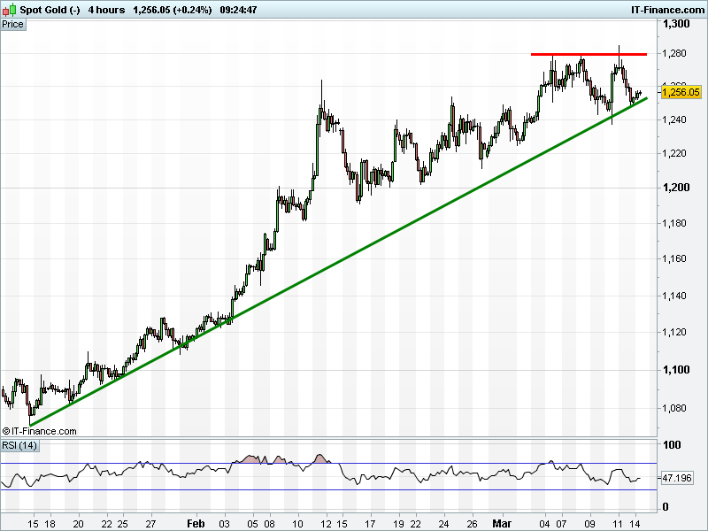 UK Index turned back just shy of 6200 to maintain a 1-week trend of falling highs. DAX broke above 10000, only to fall back just as quickly. Wall Street had an early attempt at 17200 but has settled back just below. Gold bounced off $1250 2-month rising support.