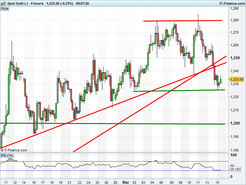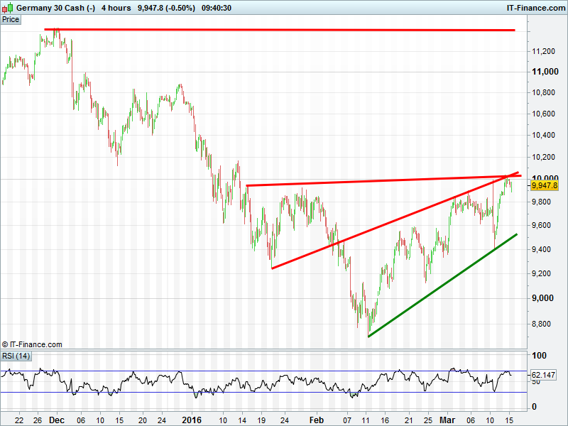 UK Index struggling under the weight of falling highs at 6140. DAX turned back from 10000 ceiling of rising channel. Wall Street back below 17200. Gold broken below rising support at $1240.