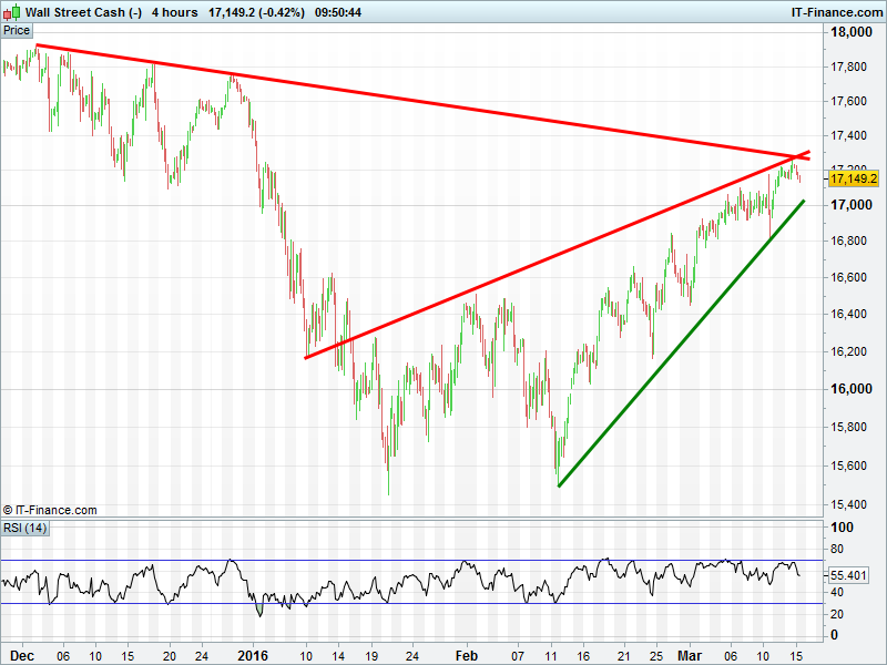 US Dow Jones back below 17200 as the duo of trendlines hampers its progress. While a small retrace may be on the cards, rising 1-month support is not far away at 17050. A break above 17300 would get the bulls excited.