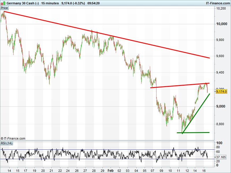 DAX rebound struggling again with sideways move since yesterday and dropped back below 9200. Uptrend support around 9120-30 still valid via 4-day uptrend. Make or break.