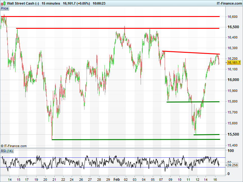 US Dow Jones turned back from 16250 to test 16150. Still sideways since mid-Jan, with a break of 16250 required before upside to 16500 can be penciled in.