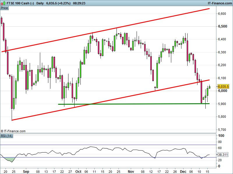 UK 100 remains strong, having broken back above 6000. Can it make it back above resistance and turn it back to support? Note RSI is rising from oversold.