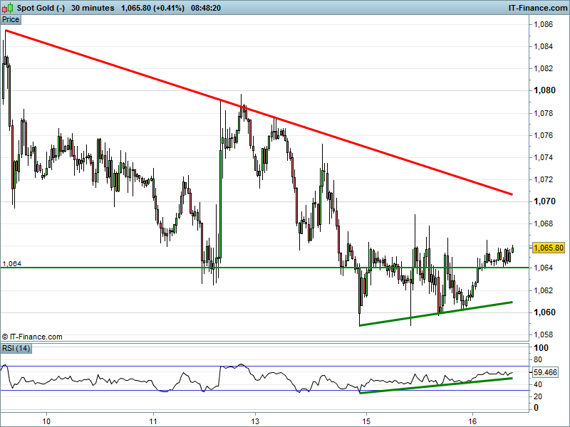 Gold is testing $1066 having recovered from yesterday’s lows. 30-minute RSI is trending upwards in bullish territory, but a USD spike later on today could initiate a reversal and a move back beneath recent lows.