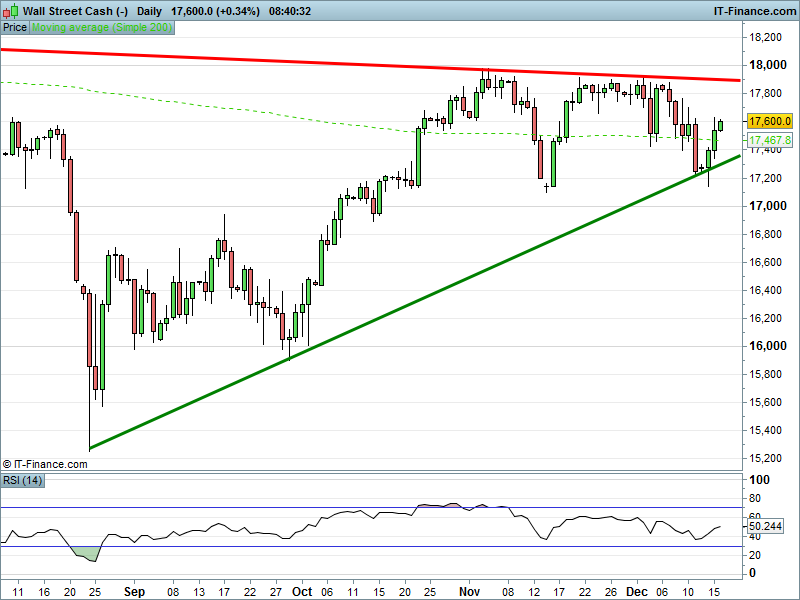 US Dow Jones futures has made a decisive break above its 200-day MA, quashing concerns about further downside indicated by yesterday’s bearish RSI. That now fighting to go positive, could another 300pts upside to long term resistance 17900 be on the cards this week? (Fed-dependent of course!)