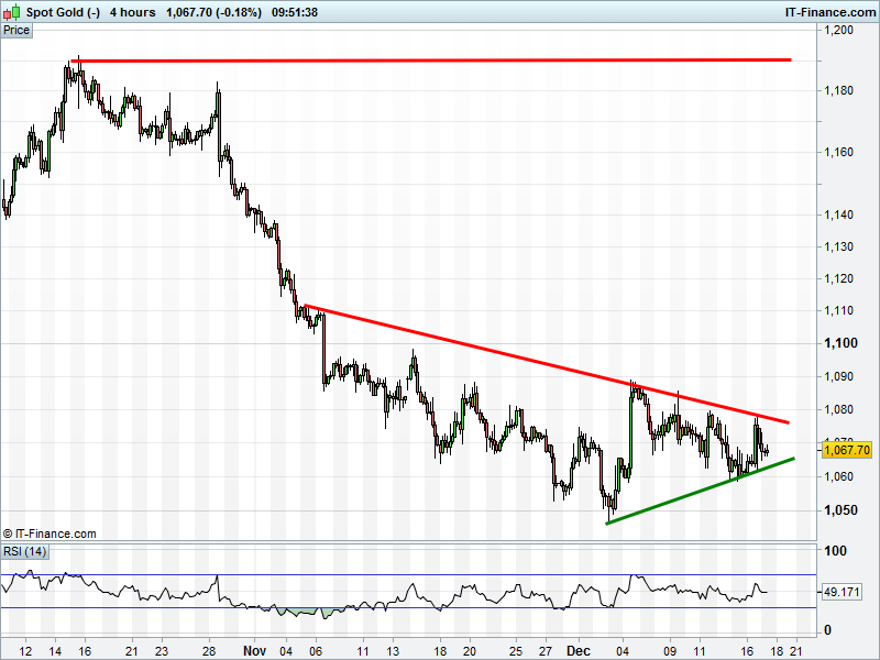 Gold back from ceiling of narrowing pattern. Will we get another bounce of rising lows? As we near the apex, will we get a break up or down?