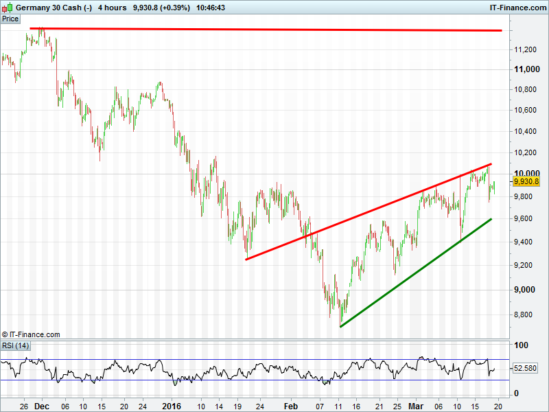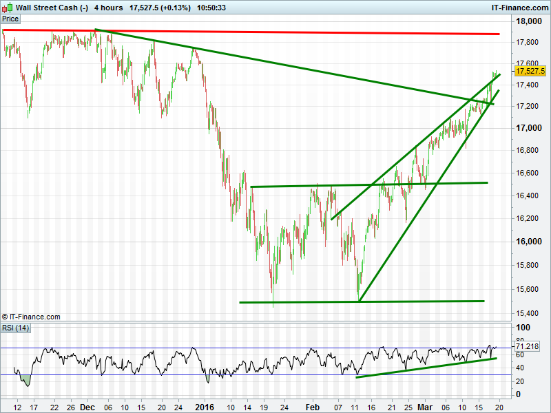 US Dow Jones made bullish break from rising wedge at 17500. Potential for gains to continue, especially after getting above 17250, however, it’d be careless not to highlight the near 13% rally of late – the same scale of move last October before a sharp reversal. RSI also suggests index now overbought (as it was by early Nov).