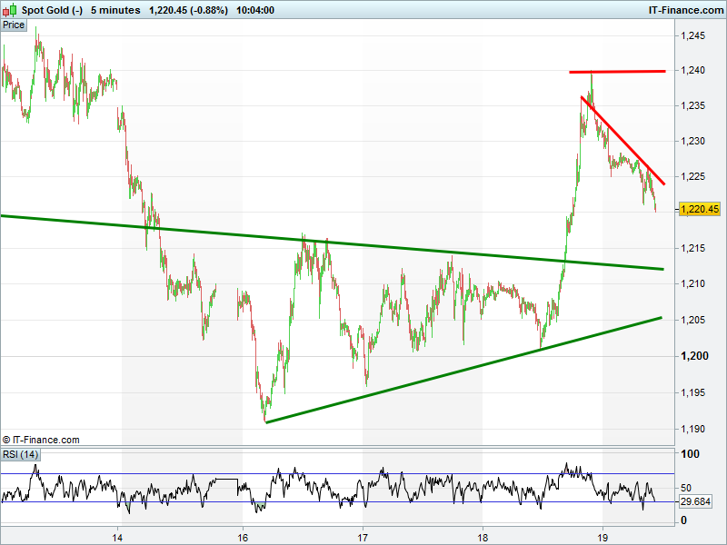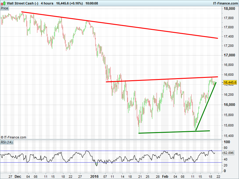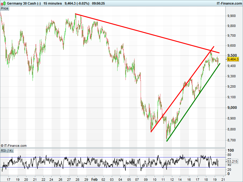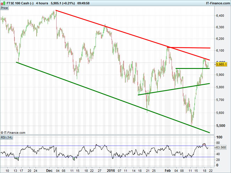 UK Index  flat around 5980, holding 4-day rising support. DAX flat around 9450 as Jan falling highs pressure the current rising channel. Wall Street flat at 16450 still waiting for a break either way. Gold struggling with $1225 falling highs since last night.