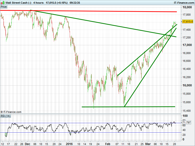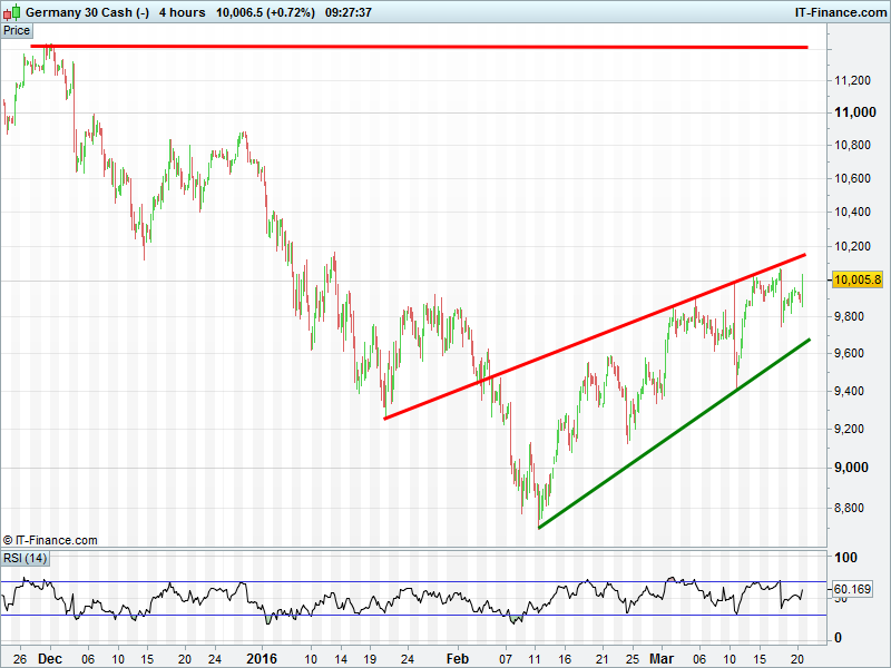 DAX having another go at clearing the 10000 hurdle, still in rising channel. Bullish breakout from 3-day narrowing pattern this morning. Helped by a weaker EUR as the USD bounced and EUR/USD FX rate pulls back from trendline of falling highs
