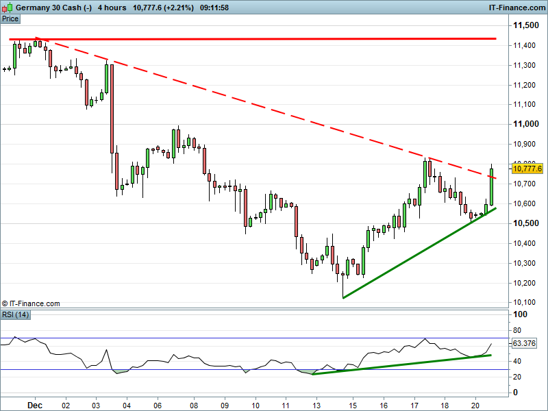 Germany’s DAX is re-testing 10800 and resistance in a narrowing pattern. The index is still in a downtrend until 11,000 is broken, the potential for which should not be written off with support just below 10600 keeping bulls’ hopes alive.