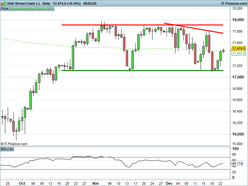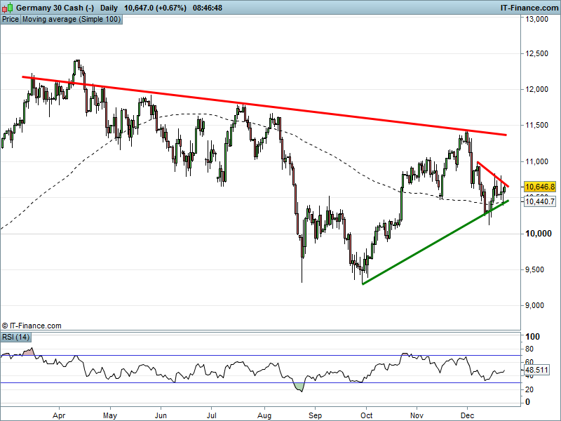 Germany’s DAX –  A narrowing pattern / pennant following the late Nov / early Dec sell-off is a concern, potentially heralding another leg down. Nonetheless, support at both Sept rising lows and the 100-day MA appears to be holding.