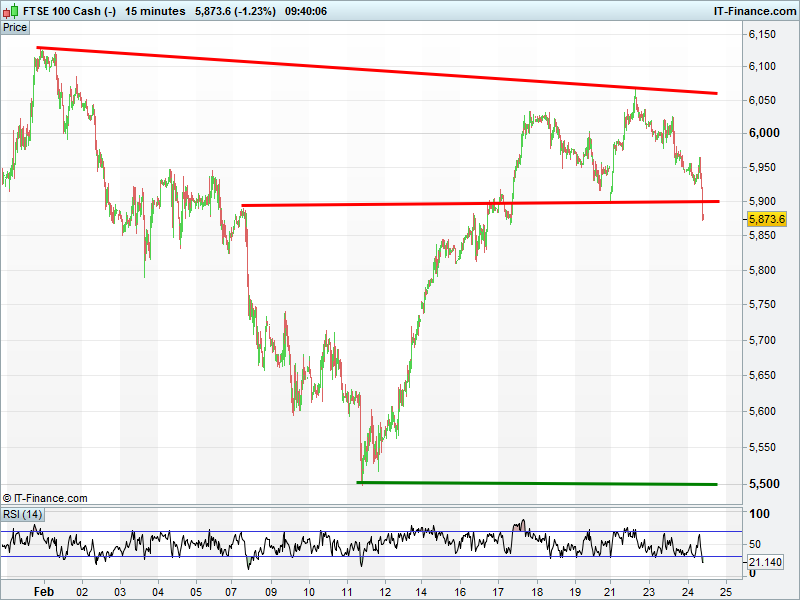 UK 100 broken below 5900 to extend its retrace and open up the possibility that we fall all the way back to recent lows 5500 and maybe even lower to the floor of the 3-month down channel.