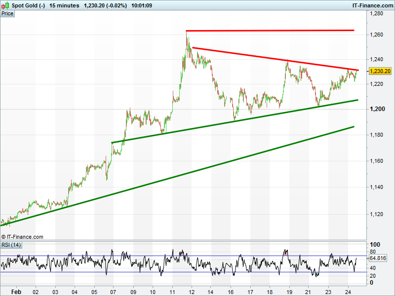Gold is back at the $1231 ceiling of its 2-week narrowing continuation pattern as global risk appetite flags. Could a breakout be on the cards as equities fall and safehavens see a revival of interest?