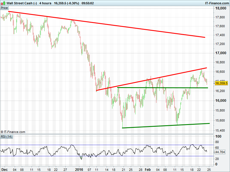 US Dow Jones still falling back from recent highs, but yet to retest 16260 support. If this level holds, potential for a bounce to make another rising high. around 16275.