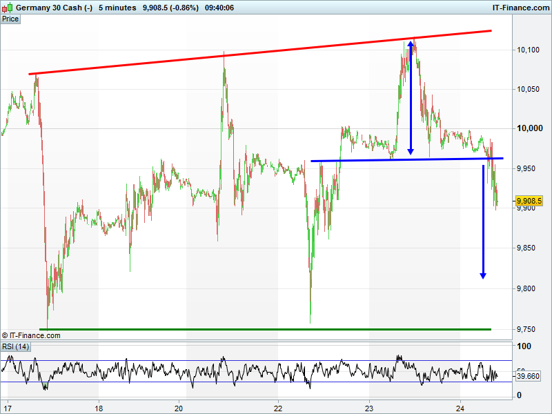 The DAX is back below 10000 and in the midst of a bearish head & shoulders reversal pattern having broken below a 9950 neckline. Potential for pattern to complete at 9800, possibly even all the way back to this week’s lows of 9750.