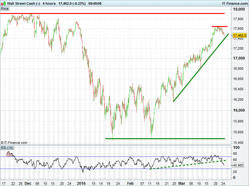 The Dow Jones is still rolling over from recent highs following a near 14% recovery rally from mid-February (RSI suggests it was overbought at the highs). Bulls eyeing rising 1-month support to 17400 to keep the party alive, while Bears watch for any suggestions of a breakdown.