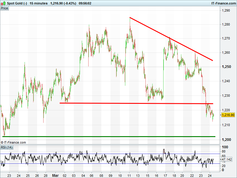 Gold has already sold back from a revisit of the breached $1225 level, cementing its move from support to resistance. Falling highs since yesterday suggests potential for a retrace to end-Feb levels just above $1200.