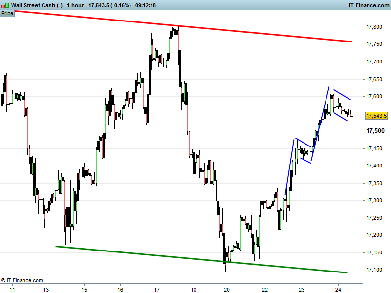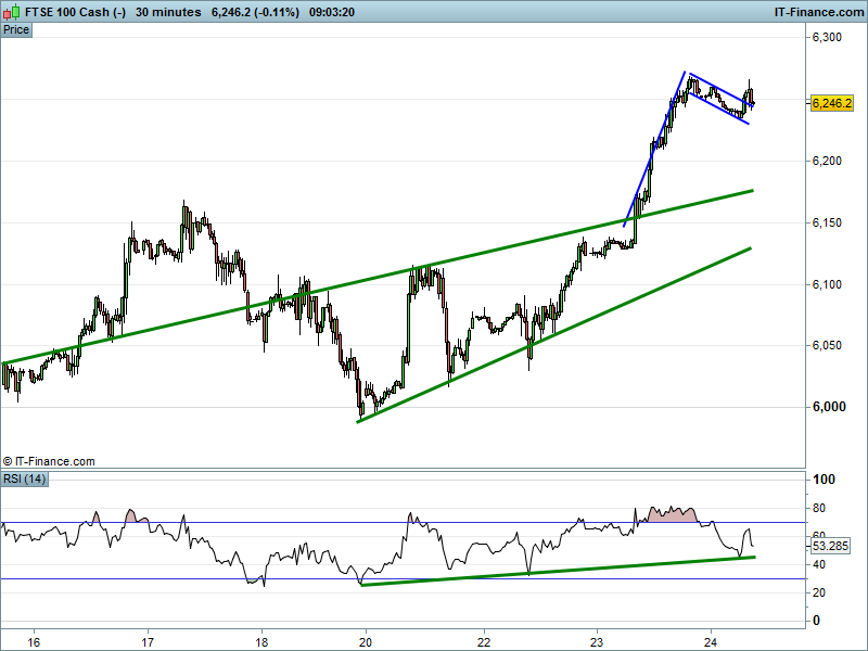 US Dow Jones futures consolidating above their 200-day MA. Scope for another bullish flag completion? Daily RSI has now ticked up into positive territory…