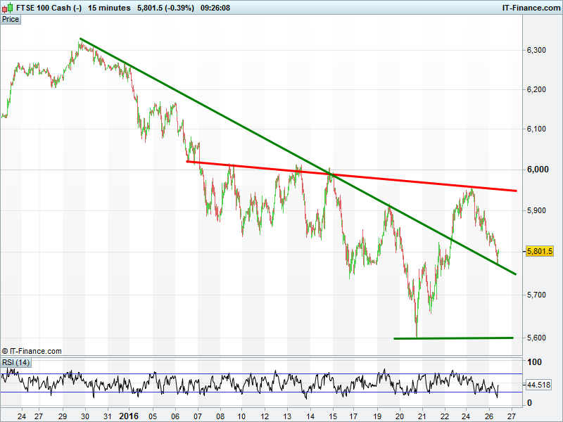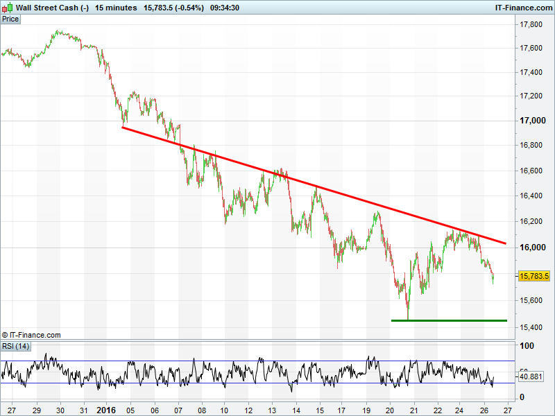 US Dow Jones broken above 2016 downtrend and now holding 16000 as last week’s late uptrend takes a break. If 16000 proves supportive this could help propel the index towards 17000