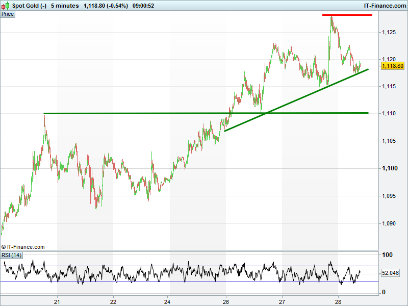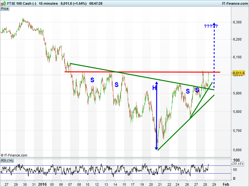 UK 100 testing 6000, having potentially broken out from complex inverse H&S reversal pattern. DAX continuing with reversal and bounce towards 10200. Wall St in rising reversal channel towards 16400. Gold holding rising support at $1118.