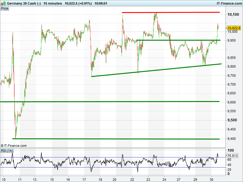 DAX broken above recent highs 9950 to regain 10000 which open up the possibility that recent highs 10100 are revisited.