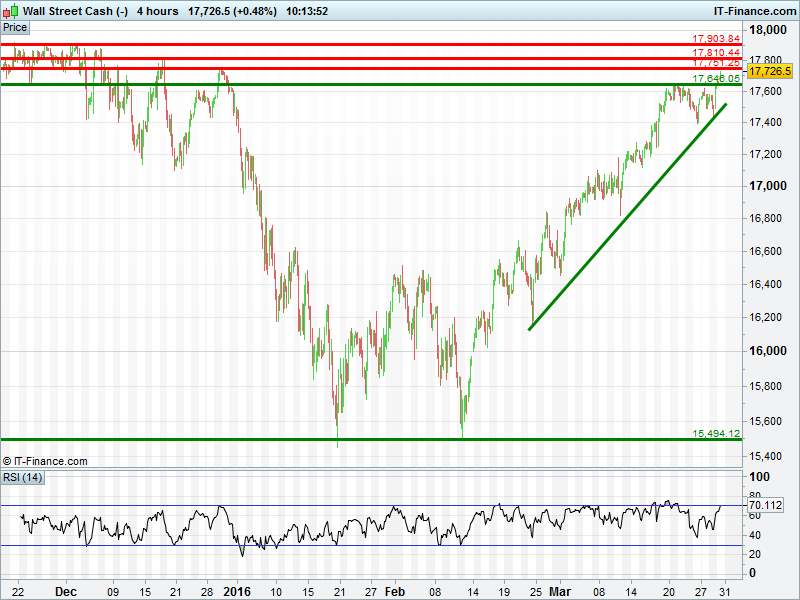 The Dow Jones has broken above 17650, extending its rebound and quest to regain Dec highs of 17900. However, note multiple potential resistance levels loom large.