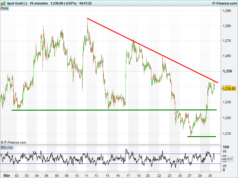 Gold made a few tests of March falling resistance at $1244 overnight thanks to the weaker USD. Pause before a breakout or retrace on the cards?