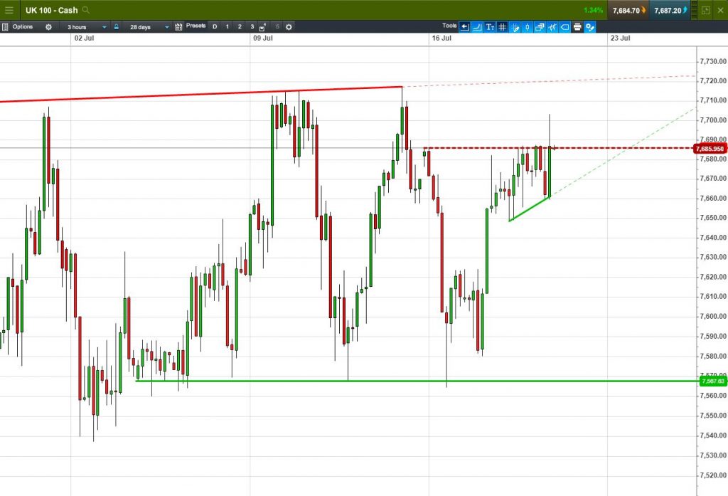Technicals: The UK 100 is testing 4-day horizontal resistance at 7686, holding above 3-day rising support.